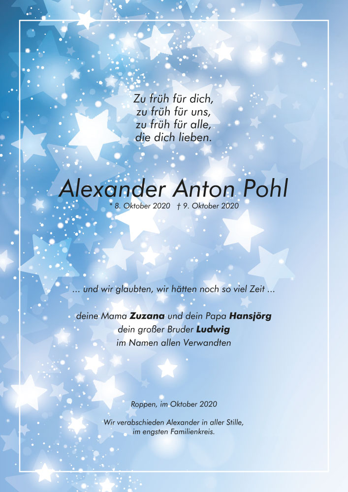 Wir kennen uns nicht, aber der Verlust eures kleinen Engels Alexander Anton - beide Namen sind übrigens wunderschön -, berührt mich sehr.