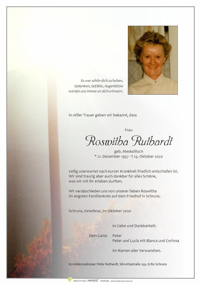 Bestattung wurde durchgeführt von: Peter Marent Bestattung Marent GmbH Gantschierstraße 80 6780 - Schruns Tel.: 05556 77070 zum Bestatter