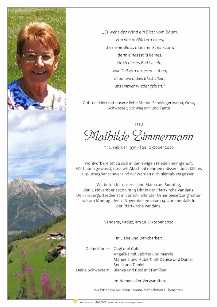 Bestattung wurde durchgeführt von: Peter Marent Bestattung Marent GmbH Gantschierstraße 80 6780 - Schruns Tel.: 05556 77070 zum Bestatter