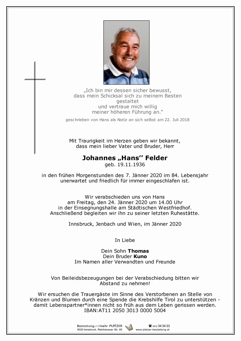 Bestattung wurde durchgeführt von: Mag. Martin Müller Concordia Bestattung 6020 - Innsbruck Reichenauer Str. 95 6060 - Hall i. T. Salzburger Str. 33 Tel.: 0512 34 34 33 Tel.: 05223 57 2 54 zum Bestatter