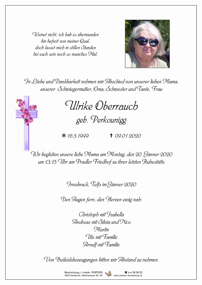 Bestattung wurde durchgeführt von: Mag. Martin Müller Concordia Bestattung 6020 - Innsbruck Reichenauer Str. 95 6060 - Hall i. T. Salzburger Str. 33 Tel.: 0512 34 34 33 Tel.: 05223 57 2 54 zum Bestatter