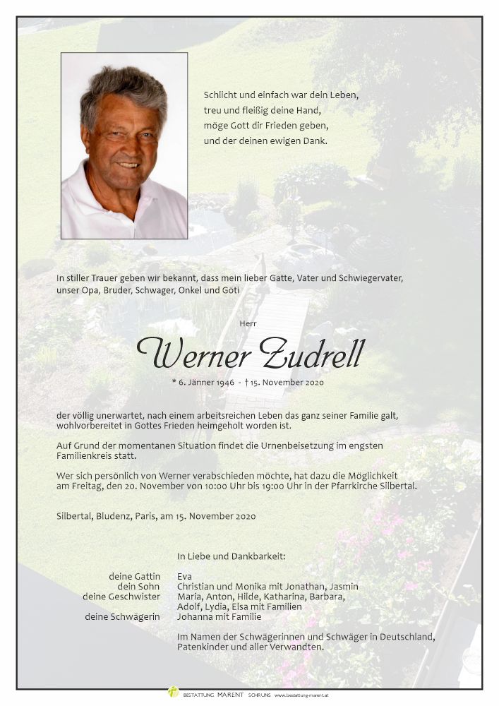 Bestattung wurde durchgeführt von: Peter Marent Bestattung Marent GmbH Gantschierstraße 80 6780 - Schruns Tel.: 05556 77070 zum Bestatter