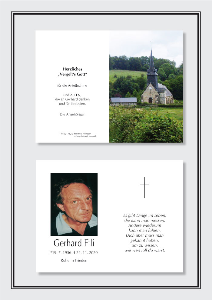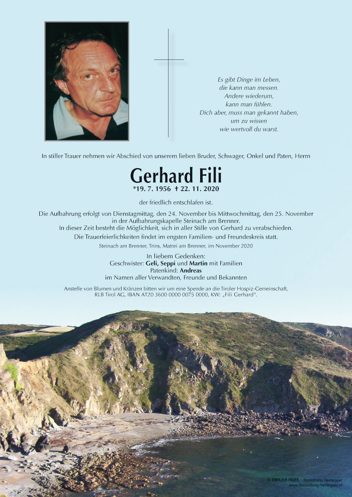 Für euch, liebe Geli, Seppi und Martin, wünsche ich viel Kraft in der Zeit der Trauer. Möge sie in eine Zeit der Freude und liebevollen Erinnerung an Gerhard übergehen.