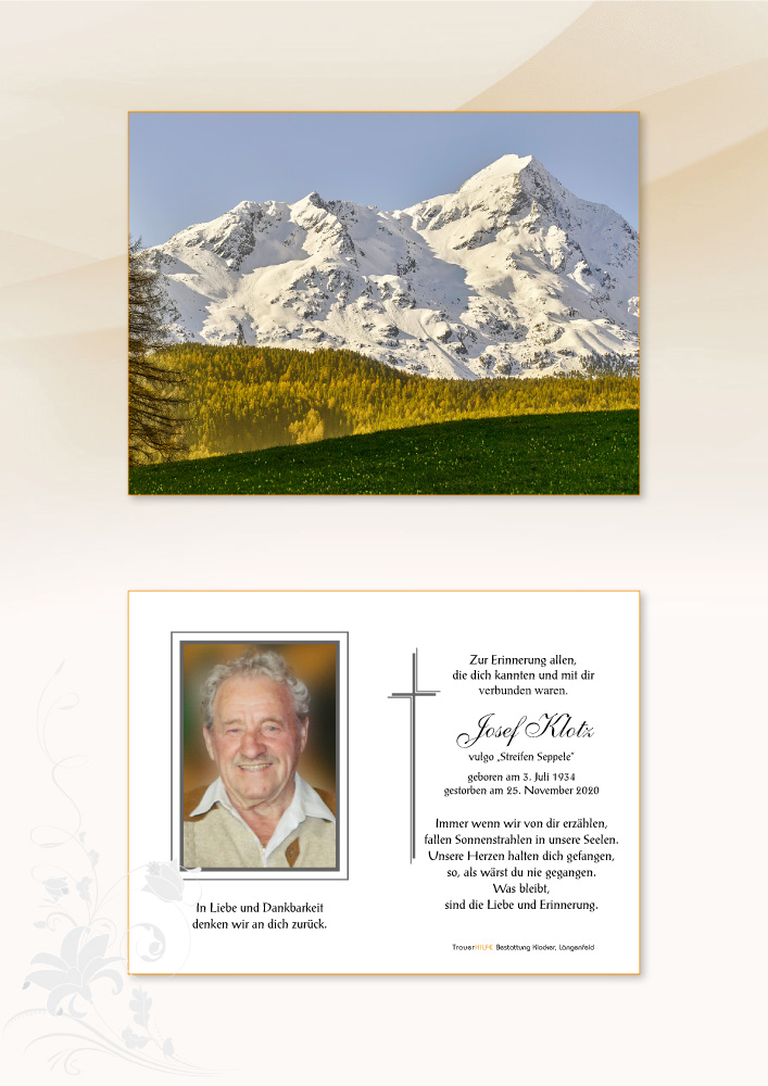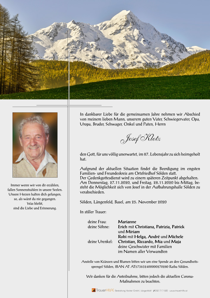Als ich heute den Anruf bekommen habe der Josef ist gestorben, habe ich kurz inne gehalten. Mir sind spontan so viele wunderschöne Erlebnisse eingefallen, die wir gemeinsam erleben durften in den letzen Jahren. Dankeschön dafür. Du warst immer ein hilfsbereiter lustiger und feiner Mensch. Ich bin dankbar, dich gekannt zu haben . Ich gönne dir die jetzt die Ruhe obwohl es doch etwas plötzlich ist. Du wirst in der Runde fehlen und ich werde dir ein ehrendes Andenken wahren.
