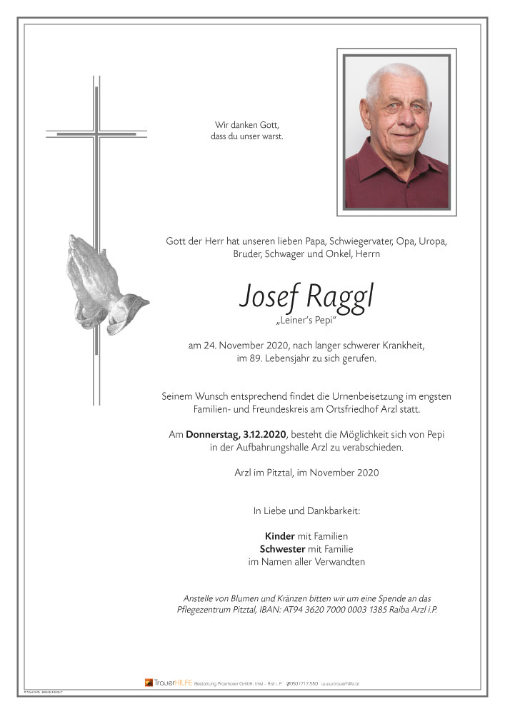 Unser Pepi wird uns mit seinem "Huangart", seinen interessanten Geschichten und seinem großen Wissen rund um die Gemeinde Arzl immer in guter Erinnerung bleiben. Pepi fühlte sich bei uns im Pflegezentrum "Dahuam" und hat sich mit all unseren Mitarbeiter/Innen bestens verstanden und immer ein nettes Gespräch. Wir werden dich vermissen und wünschen dir eine gute Reise! Ruhe in Frieden Pepi!