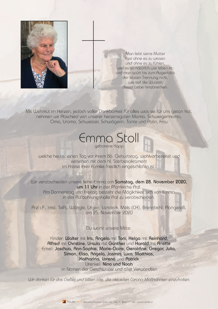 zum Ableben eurer lieben Mama und Oma Emma entbieten wir euch unsere aufrichtige Anteilnahme und wünschen euch viel Kraft für die kommenden schweren Tage. Wir sind in Gedanken bei euch.