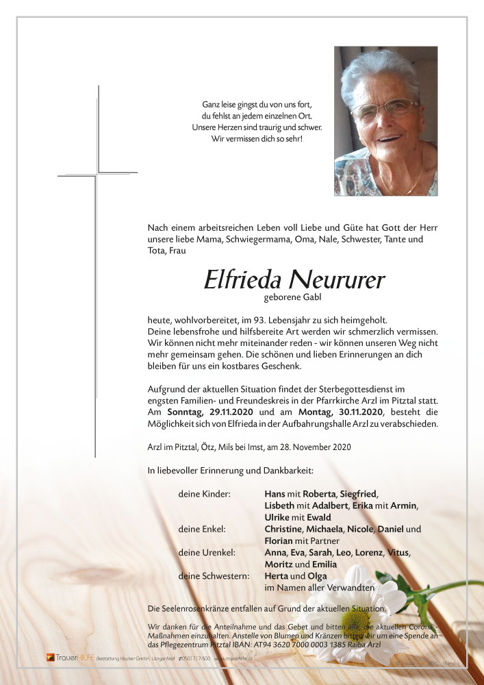 Elfrieda ist immer neben Herta im Pflegezentrum gesessen und sie war eine lustige und herzensgute Frau. Wir werden sie stets in guter Erinnerung behalten. Wir möchten euch allen unser aufrichtiges Beileid aussprechen und viel Kraft für die schwere Zeit wünschen.01.12.2020 11:35 - Bair Barbara, Irene & Bernhard mit Familie