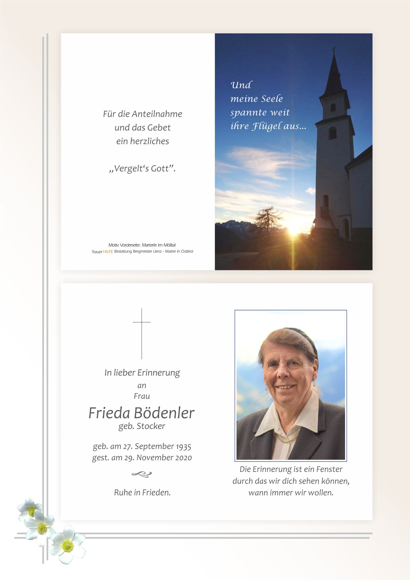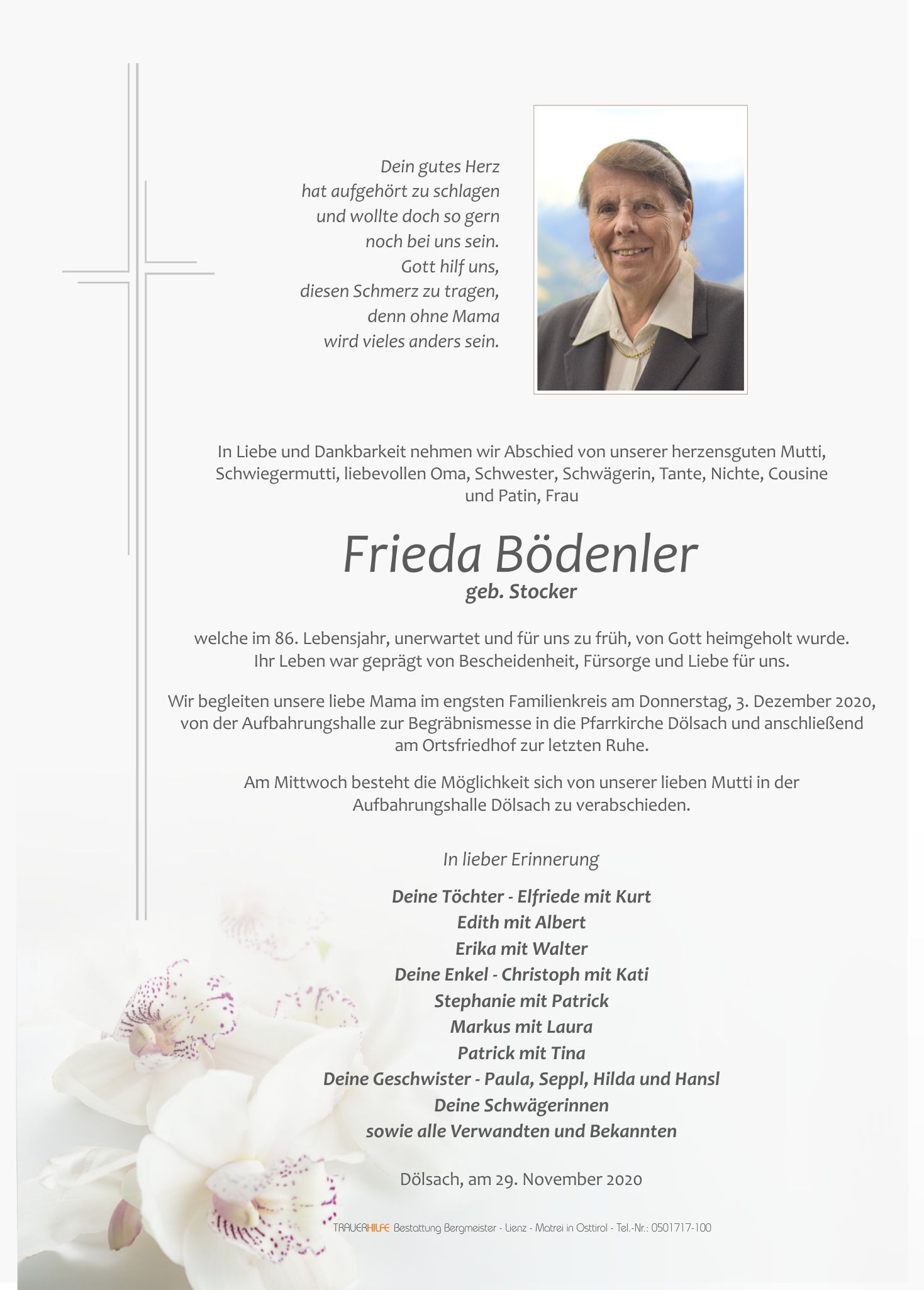 So still wie Frieda gelebt hat, ist sie nun wieder von dieser Erde gegangen. Möge ihr Geist in euch weiterleben und die Erinnerung an die vielen schönen gemeinsamen Jahre euch Trost in dieser schweren Zeit sein.