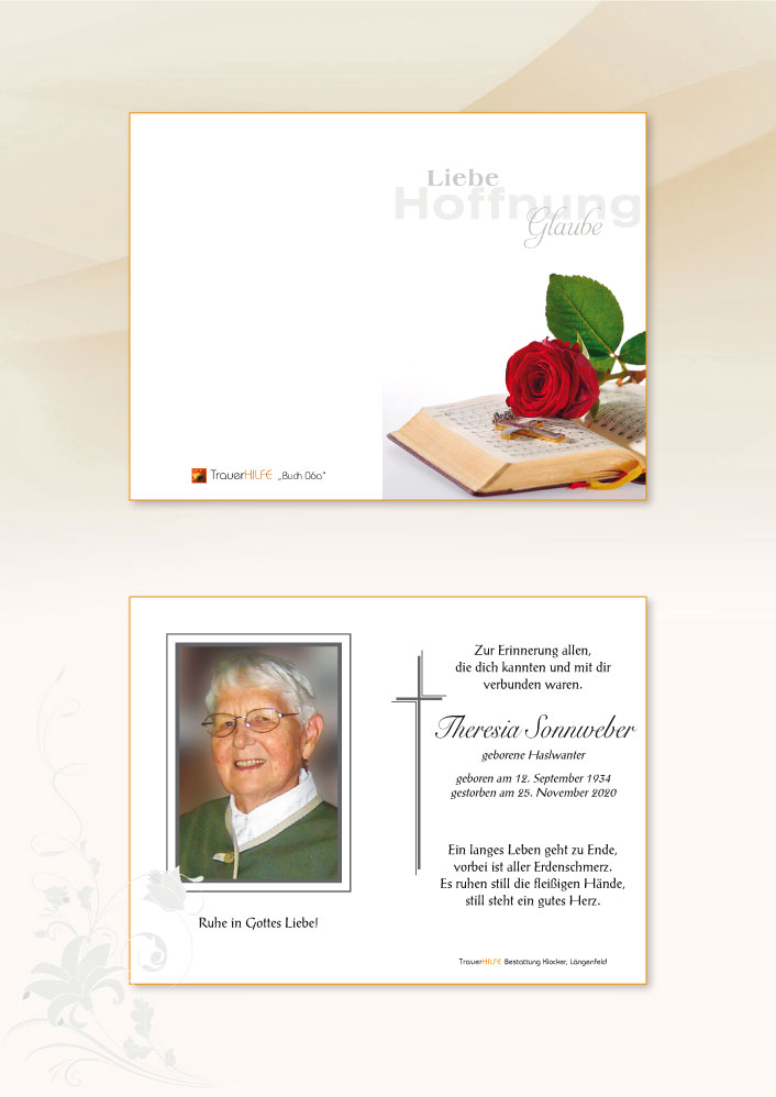 Wenn der Nebel dieser schweren Stunden sich lichtet, wünschen wir euch, dass die Erinnerung an eure liebe Resi und euren lieben Hans bestimmt werden von Gedanken an glückliche Zeiten, schönen Ereignissen und fröhlichen Stunden.