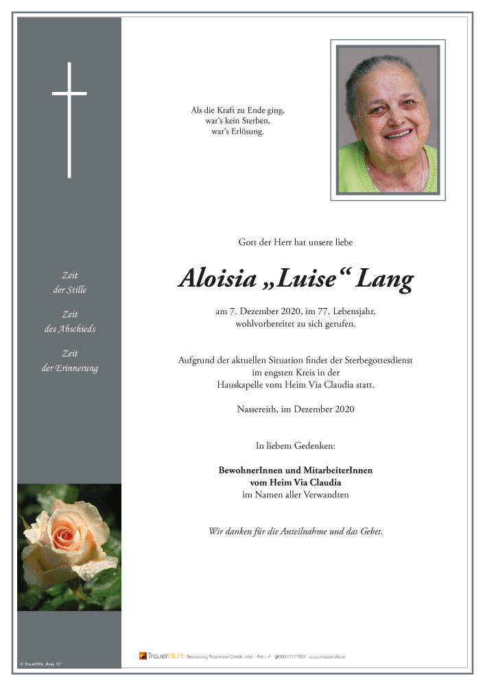Herr gib ihr die ewige Ruhe und das ewige Licht leuchte ihr. RIP. Ruhe in Frieden Aloisia.