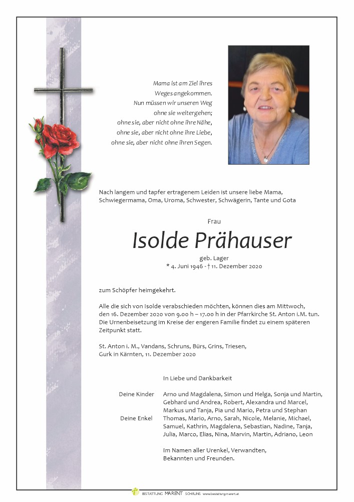 Bestattung wurde durchgeführt von: Peter Marent Bestattung Marent GmbH Gantschierstraße 80 6780 - Schruns Tel.: 05556 77070 zum Bestatter