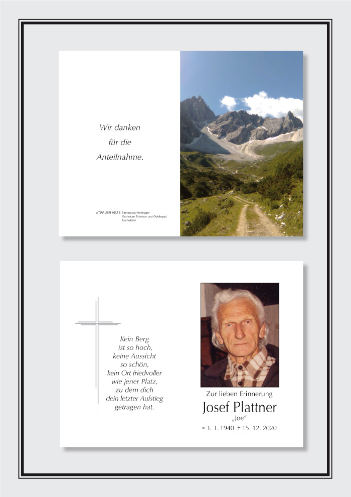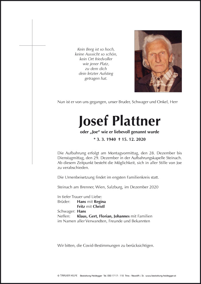 Bestattung wurde durchgeführt von: Karl Neurauter Karl Neurauter Bestattung Heidegger Brennerstraße 69 6150 - Steinach am Brenner Tel.: 05275 5211 zum Bestatter