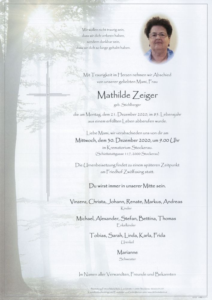 Bestattung wurde durchgeführt von: Frittum Maria Anna TrauerHilfe Bestattung Frittum Bahnstrasse 255 2041 - Wullersdorf Tel.: 050 1717-600 zum Bestatter