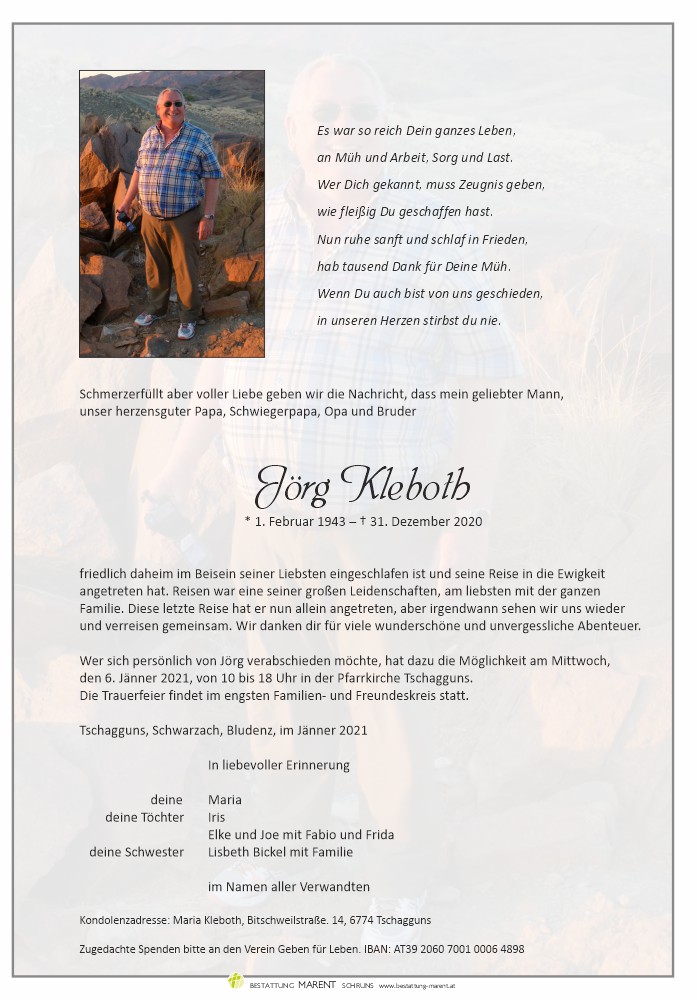 Bestattung wurde durchgeführt von: Peter Marent Bestattung Marent GmbH Gantschierstraße 80 6780 - Schruns Tel.: 05556 77070 zum Bestatter