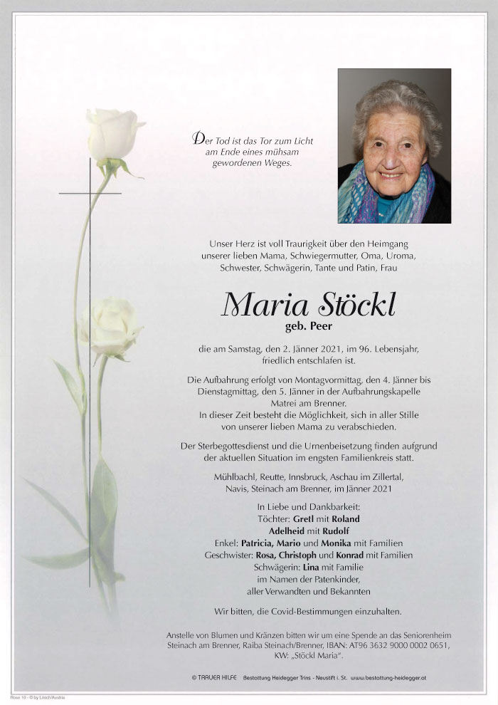 Bestattung wurde durchgeführt von: Karl Neurauter Karl Neurauter Bestattung Heidegger Brennerstraße 69 6150 - Steinach am Brenner Tel.: 05275 5211 zum Bestatter