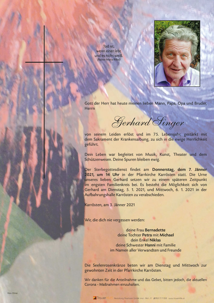 Mein allerherzlichstes Beileid zum Eurem Verlust. Erst musstet ihr den Joachim "Joggl" gehen lassen und nun auch den Gerhard. Trotz das wir lange keinen Kontakt hatten trifft es mich schwer zu sehen wie hart das Schicksal euch getroffen hat. Ich bin in Gedanken bei euch und wünsche euch von Herzen viel Kraft und Zuversicht für die schweren Stunden. In stillem Gedenken Helmut