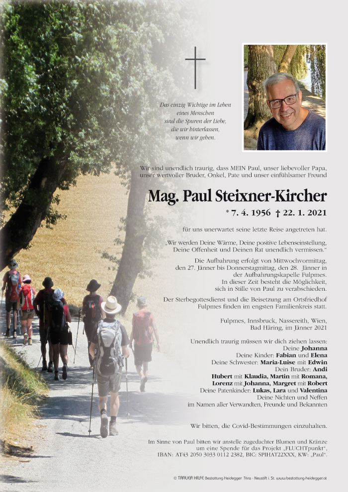 dein so rascher Tod trifft mich sehr. Viele Erinnerungen aus der Zeit in der Kath.Landjugend wie Taize`Fahrten, Obstbäume pflanzen und heisse Diskussionen werden wach. Die gemeinsamen Busfahrten nach Innsbruck zur Arbeit und retour, die politischen und privaten Gespräche, du warst ein sehr aufrichtiger, herzerwärmender Mann; danke für die Begegnungen!