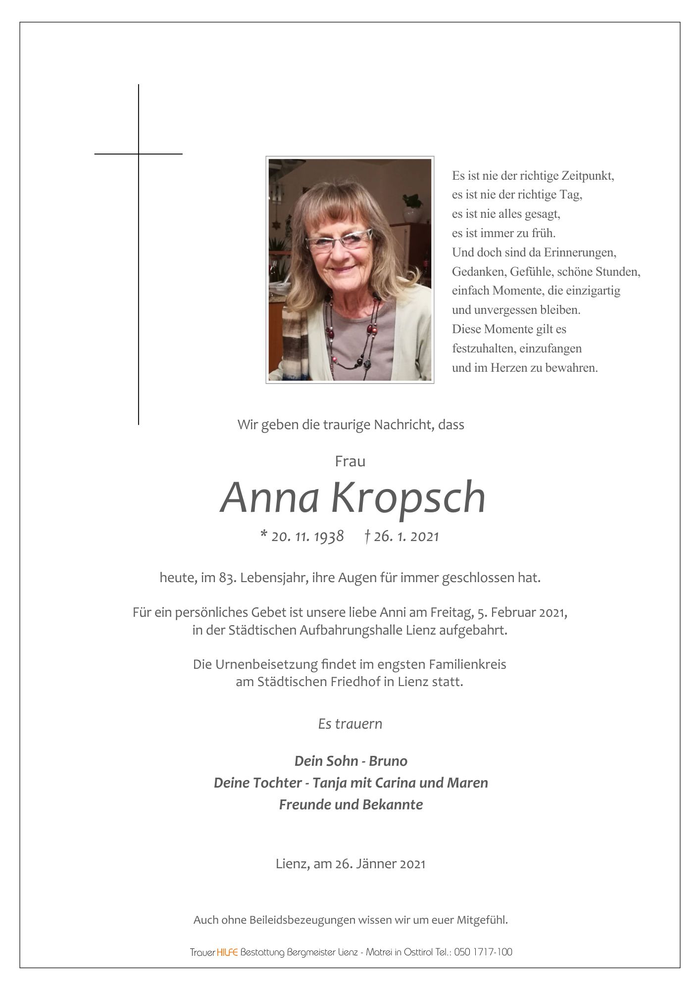 Liebe Tanja, liebe Maren und Carina wir trauern mit euch.Wir haben eine gute Freundin verloren.Oft werden wir an Anni denken.Wir wünschen euch viel Kraft unsere Gedanken sind bei euch.Mario,Helga,Julia mit Florian und Leticia