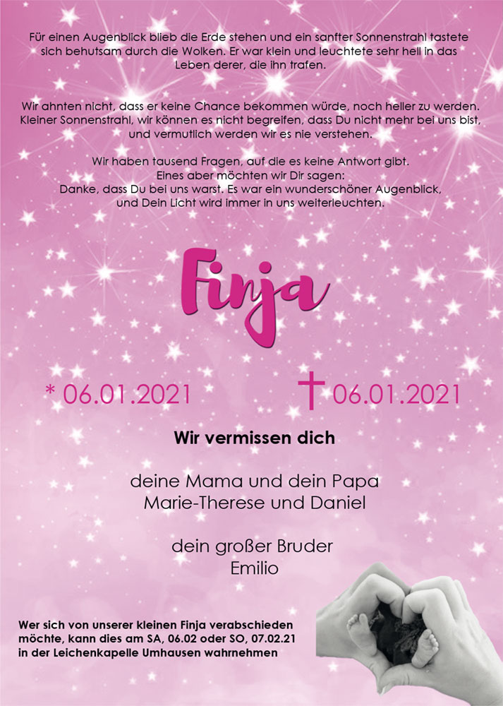 Liebe Finja, du besonderer kleiner Engel ❤ Ich hoffe du bist gut im Himmel angekommen und fühlst dich wohl bei den vielen anderen Sternenkindern ⭐ Schau fest auf deine Eltern und sende ihnen Kraft, Zuversicht und Hoffnung!06.02.2021 13:41 - Sternenkindmama aus Neustift ☆