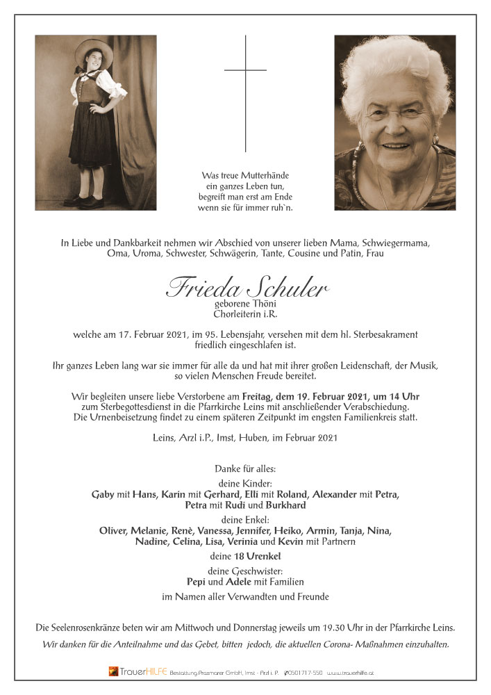 Mit großer Betroffenheit haben wir erst diesen Moment erfahren, daß Frieda in die ewige Heimat abberufen wurde. Wir fühlen mit euch und wünschen euch Kraft und Zusammenhalt. Viele Spuren der Liebe und Hilfsbereitschaft bleiben uns in Erinnerung und all die schönen Stunden beim Singen mit Frieda werden stets in meinem Herzen lebendig bleiben.