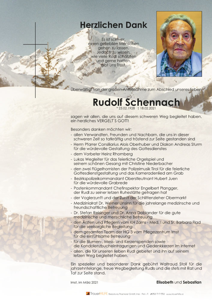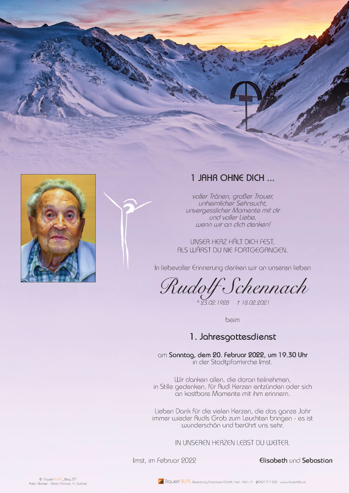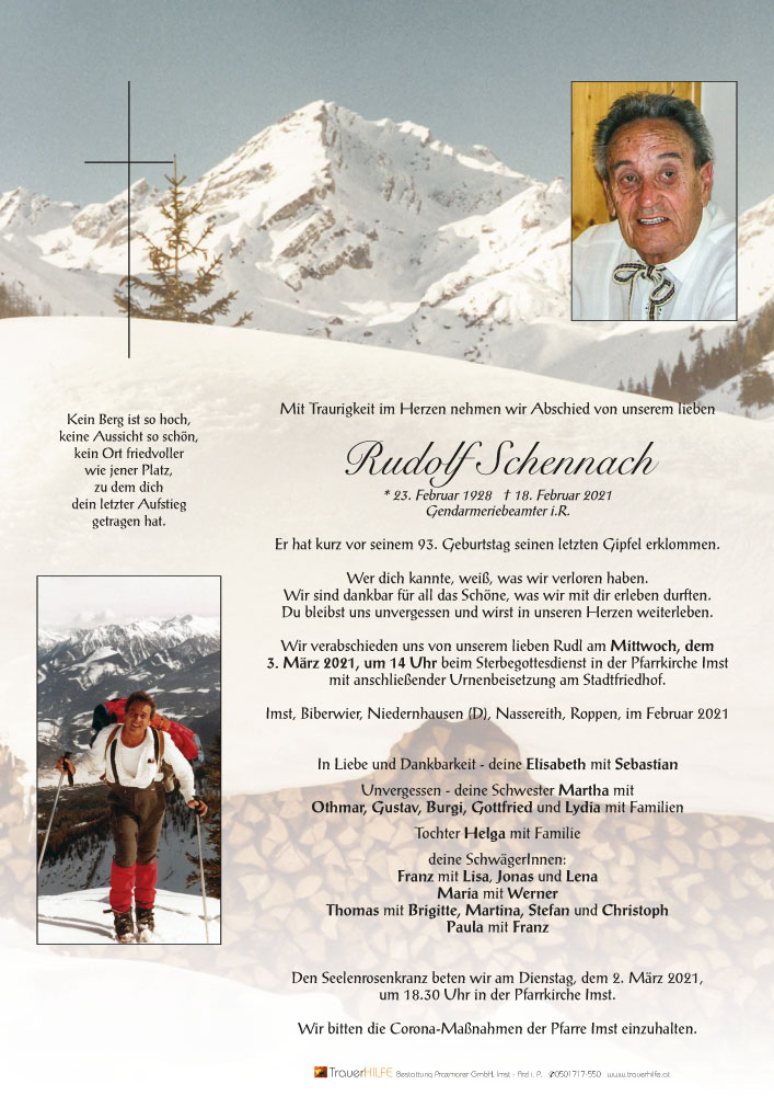 Gott der Herr hat unsern Rudl auf den Gipfel des Lebens geholt. Rudl wird dort oben gebraucht. Er erhält den Lohn für sein kameradschaftliches Miteinander und für all die Jahre, die wir seine Freundschaft erleben durften.