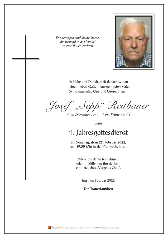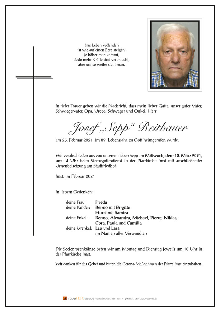Lieber Onkel Sepp, ich habe viele schöne Erinnerungen aus Kindertagen, oft durfte ich mitfahren wenn ihr Ausflüge gemacht habt. Auch später war ich immer herzlich willkommen in Eurem Haus. Du warst ein ganz besonderer Mensch und ich bin sicher du bekommst ein ganz besonders schönes Platzle im Himmel. Ruhe in Frieden und grüß mir den Rest der Familie die uns vorausgegangen sind.26.02.2021 18:23 - Ingrid mit Familie