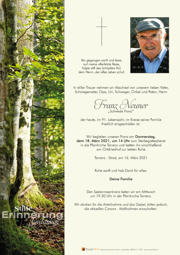 wir möchten unsere aufrichtige Anteilnahme ausdrücken. Möge Franz seinen ewigen Frieden finden.16.03.2021 22:34 - Fam. Manfred Wegleiter