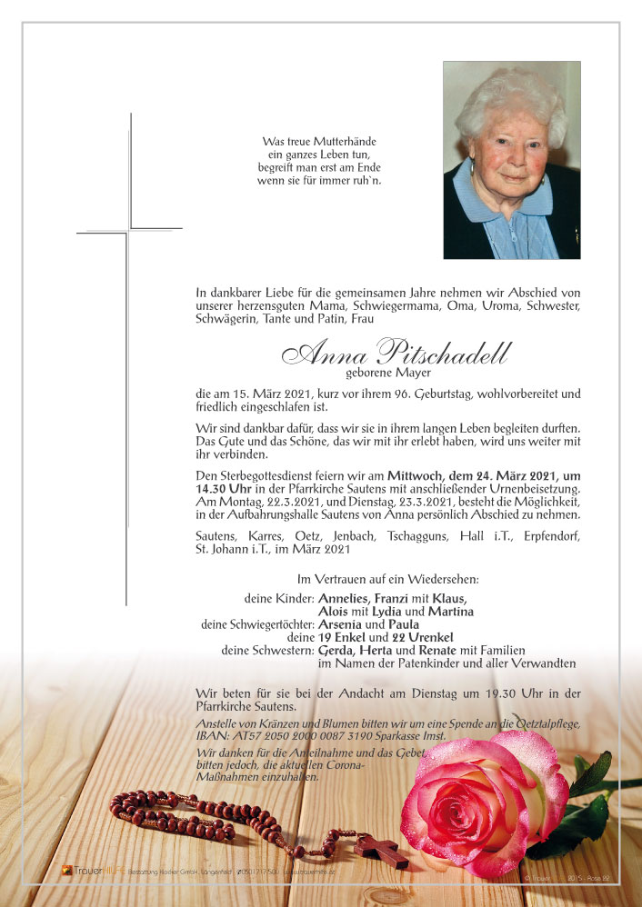 Zum Heimgang eurer geliebten Mama, Oma und Uroma Anna möchten wir euch unsere "Aufrichtige Anteilnahme" und unser Mitgefühl entgegenbringen.