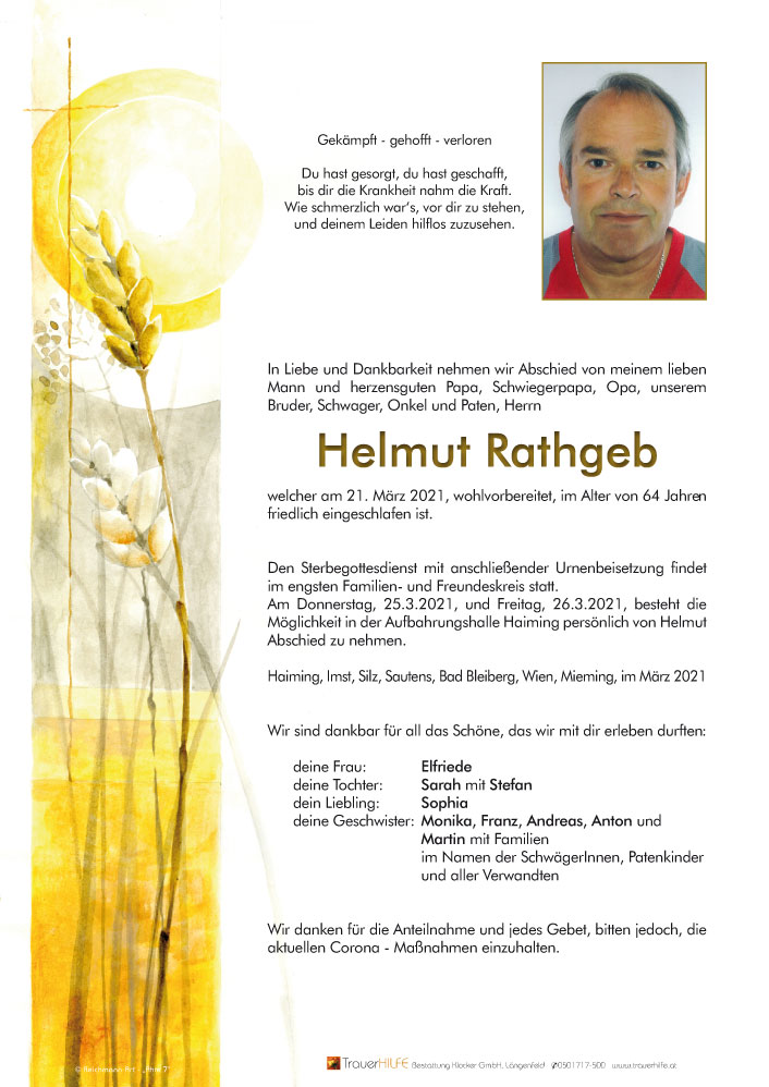 Unser aufrichtiges Beileid allen Angehörigen. Wir sind alle mit den Gedanken bei euch allen.22.03.2021 15:53 - Fam. Gomig Josef und Johanna Imst