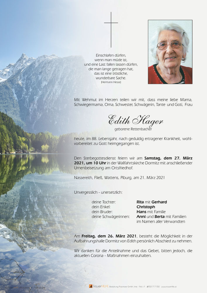 so werde auch ich, Edith in Erinnerung behalten, durfte sie kennen lernen und schätzte Ihre angenehme Art und Ihren Humor. Dankeschön dafür.