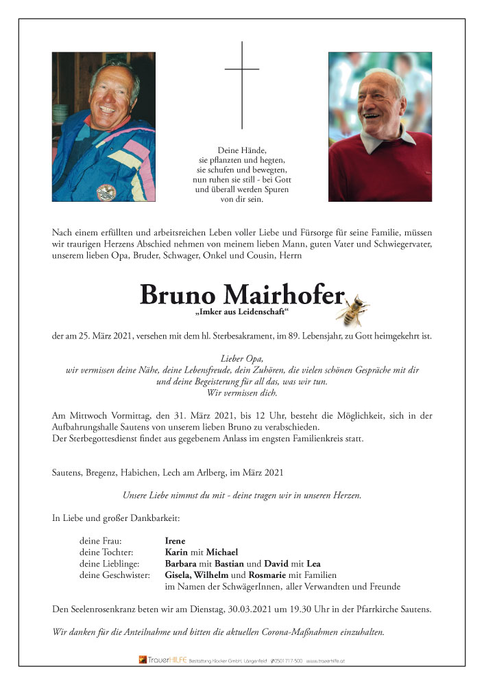 Irene, Karin und Michael mit Kindern, Euch wünsche ich viel Kraft und die schönen Erinnerungen und Anekdoten an Euren Bruno sollen Euch die Trauer leichter machen.