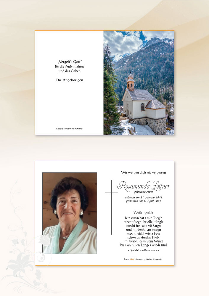 Es ist ein Geschenk des Lebens, Rosamunde gekannt zu haben. Sie hat einen großen Platz in unserem Herzen eingenommen und wird uns weiterhin auf unserem Lebensweg begleiten. Sie hat uns immer so lieb und herzlich empfangen und mit uns ihre Liebe zum Ötztal geteilt. Wie werden sie so in Erinnerung behalten, wie sie für uns war, eine liebe Frau, mit der man gerne über das Leben gesprochen hat.