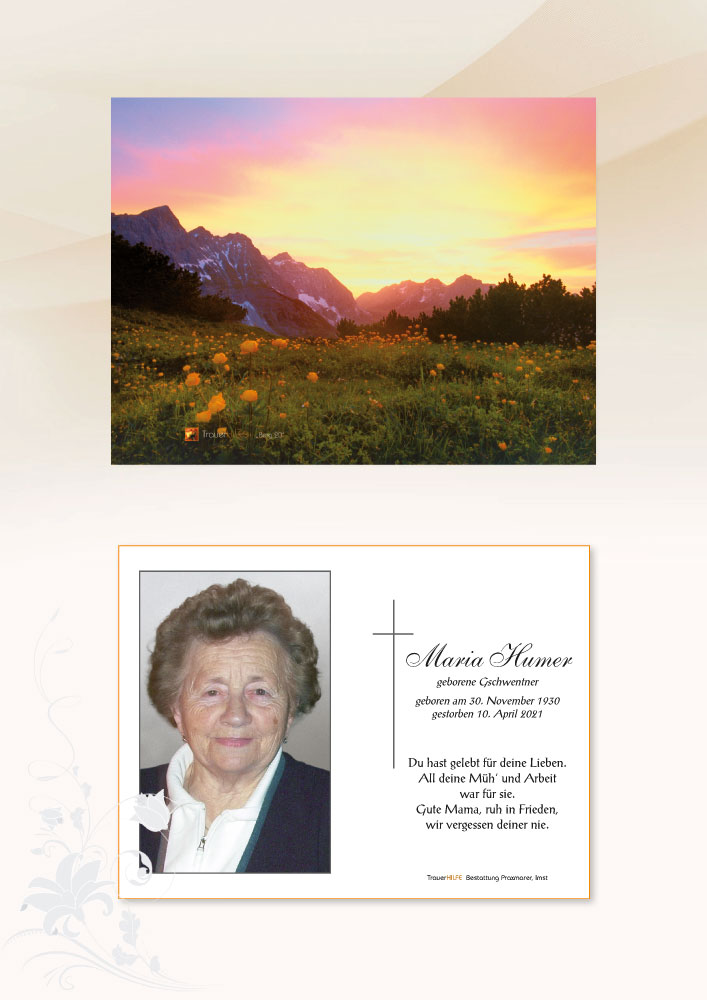 • Ein ganz herzliches Vergelt's Gott für die vielen Kerzen, die tröstenden Worte und die grosse Anteilnahme. Das hätte unsere Mama sehr gefreut und uns hat es in diesen schweren Stunden und Tagen sehr geholfen.