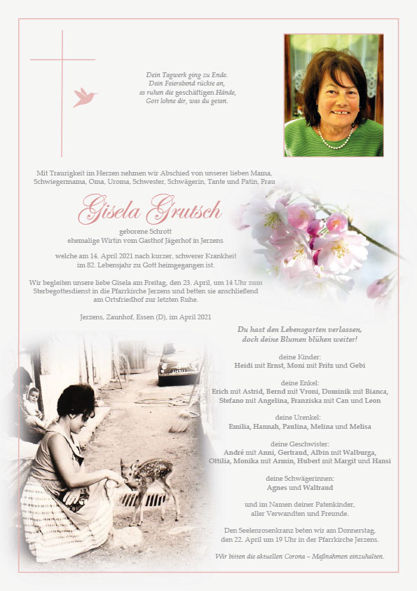 Mein Beileid zum Ableben von Frau Grutsch. Wir haben viele schöne Erinnerungen an unsere gemeinsame Zeit im Gasthof Jägerhof. Sie wird immer in unseren Gedanken bleiben.18.04.2021 19:04 - Dolf und Anne van Opstal-de Rooij