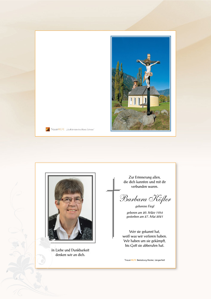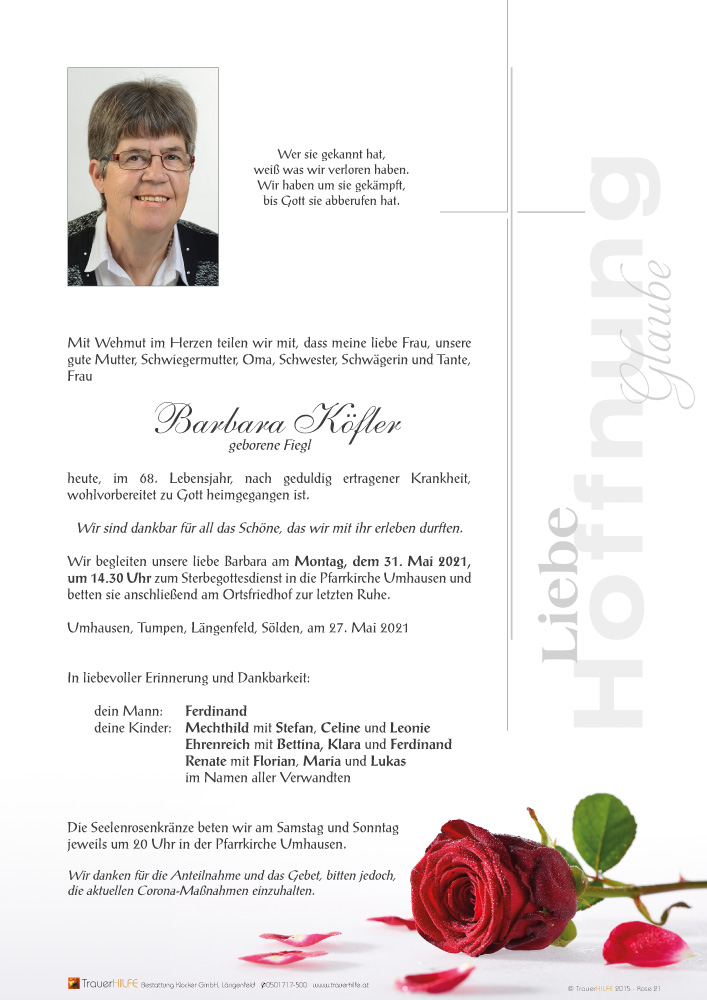 Aufrichtige Anteilnahme am Tode Eurer lieben Barbara, entbieten Familie Scharfetter,