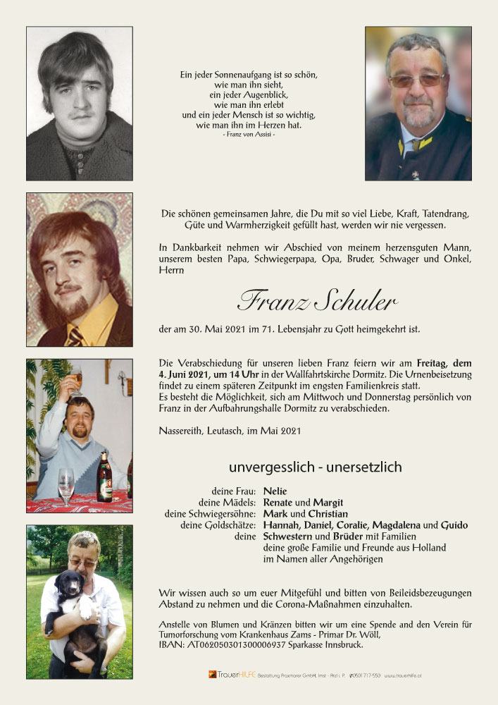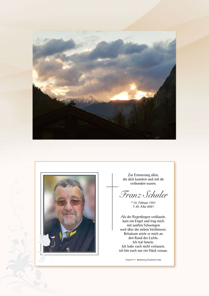Bestattung wurde durchgeführt von: Daniel Klocker Bestattung Praxmarer GmbH Thomas Walch Str. 4 6460 - Imst Tel.: 05412 64250 zum Bestatter