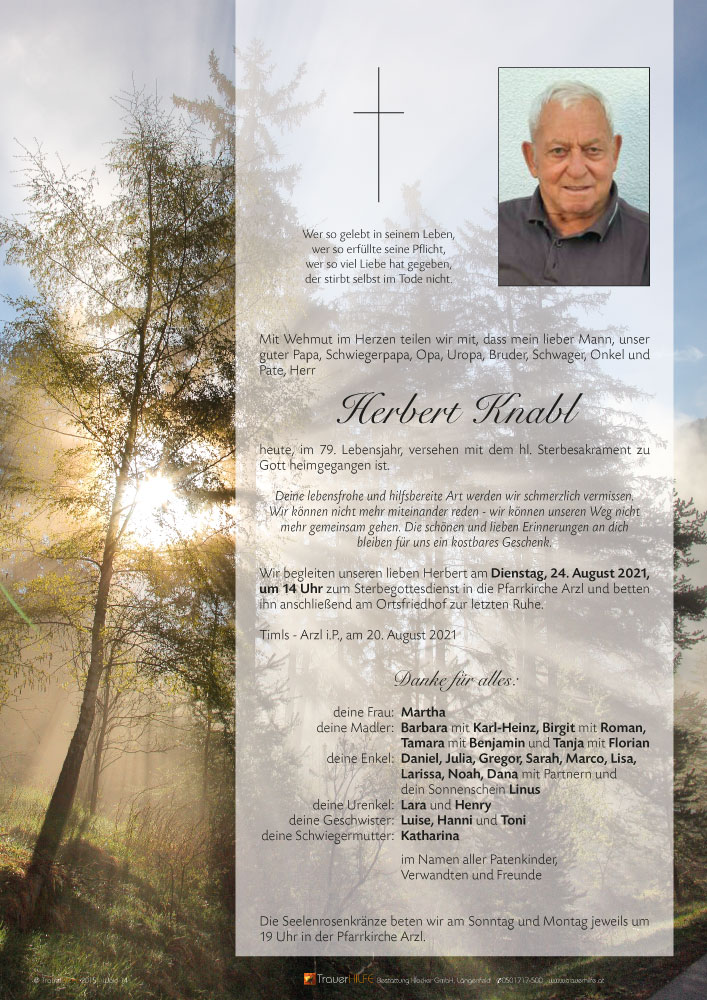 Liebe Familie Knabl, auch wenn man weiß dass der Tag kommen wird, ist es schwer das Ende anzunehmen. Wir wünschen Euch viel Kraft und denken an Euch. Unser aufrichtiges Beileid. Lieber Herbert, ruhe in Frieden
