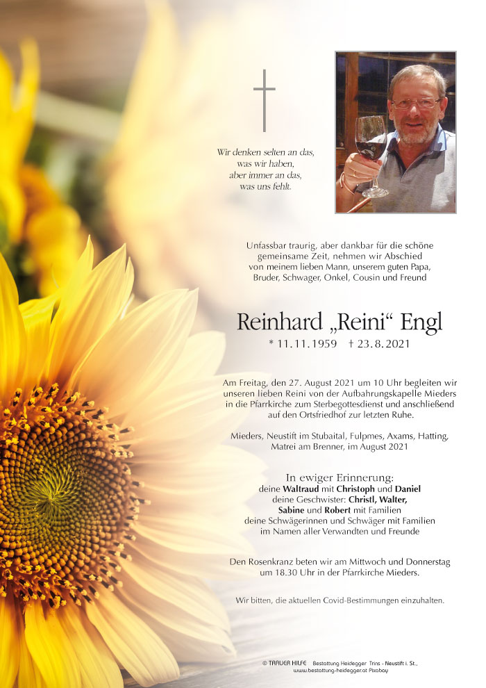 Liebe Traudl Christoph und Daniel! Unser aufrichtiges Beileid! Wir sind in Gedanken bei euch! Lieber Reini! Danke für alles was du für uns getan hast! Machs guat und Ruhe in Frieden! Michael und Silvia Wellscheller mit Christian und Leonie