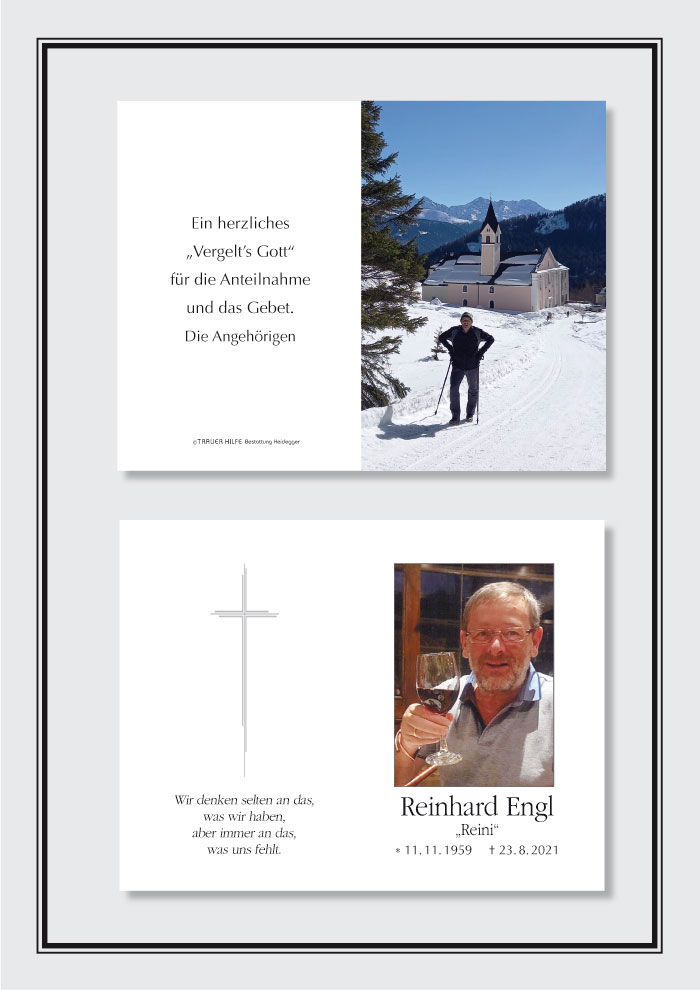Reini, der Schock über die Nachricht deines Ablebens sitzt noch tief, die Trauer und der Schmerz sind unheimlich groß. Die Hoffnung und Gewissheit, dass die Freude mit dir vieles erlebt zu haben, die Trauer überwindet, lässt es ein wenig leichter ertragen. Reini, DANKE, dass du durch deinen unermüdlichen, unentgeltlichen Einsatz so viele Projekte umgesetzt hast, ohne jemals deinen Namen darunter zu setzen. Reini, durch deine unaufgeregte Art, deine Verlässslichkeit, deine Kompetenz, deine Beharrlichkeit und Hilfsbereitschaft warst du immer ein Vorbild, und es ist dir gelungen, die Welt, besonders für die Miederer, zu verbessern.