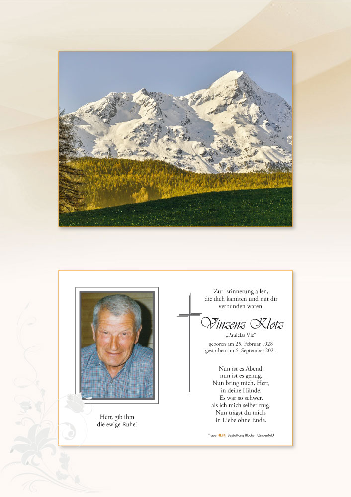 Bestattung wurde durchgeführt von: Daniel Klocker Bestattung Klocker GmbH Oberlängenfeld 41 6444 - Längenfeld Tel.: 05253 5561 zum Bestatter