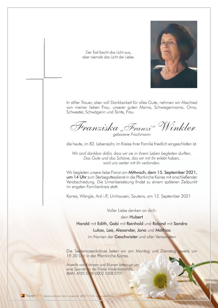 Zum Heimgang eurer lieben Franzi unser Aufrichtiges Mitgefühl.Es ist schwer einen lieben Menschen gehen zu lassen,aber es war vieleicht auch Erlösung. Werden sie nicht vergessen. Adolf & Franzi.17.09.2021 10:36 - Fam. Adolf Mang nassereith