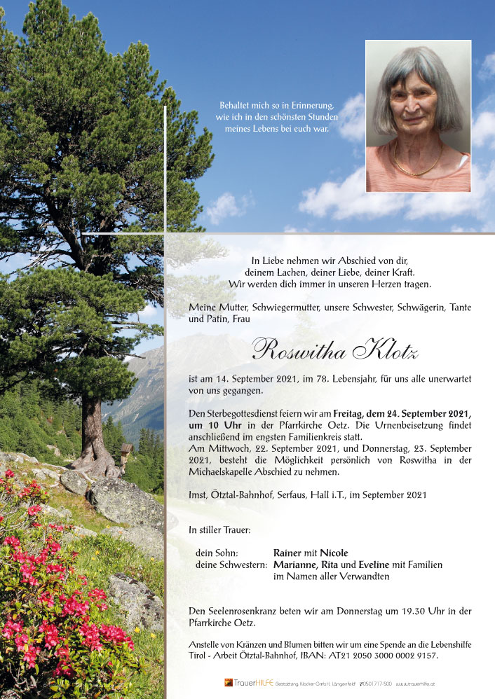 • Liebe Marianne mit Familie! Es tut furchtbar weh, wenn man einen geliebten Menschen verliert. Was uns bleibt sind die schönen Erinnerungen an eine Persönlichkeit die unser Leben geprägt, begleitet und reicher gemacht hat. Vertrauen und glauben wir ganz fest daran, dass der Tod nicht das Ende sondern der Beginn einen neuen Lebens ist. Roswitha ist nun bei Gott gut aufgehoben und schickt Euch von Oben Kraft die Trauer in ein dankbares Lächeln zu wandeln. In Gedanken mit Euch verbunden Ruth & Günter mit Laura & Ella