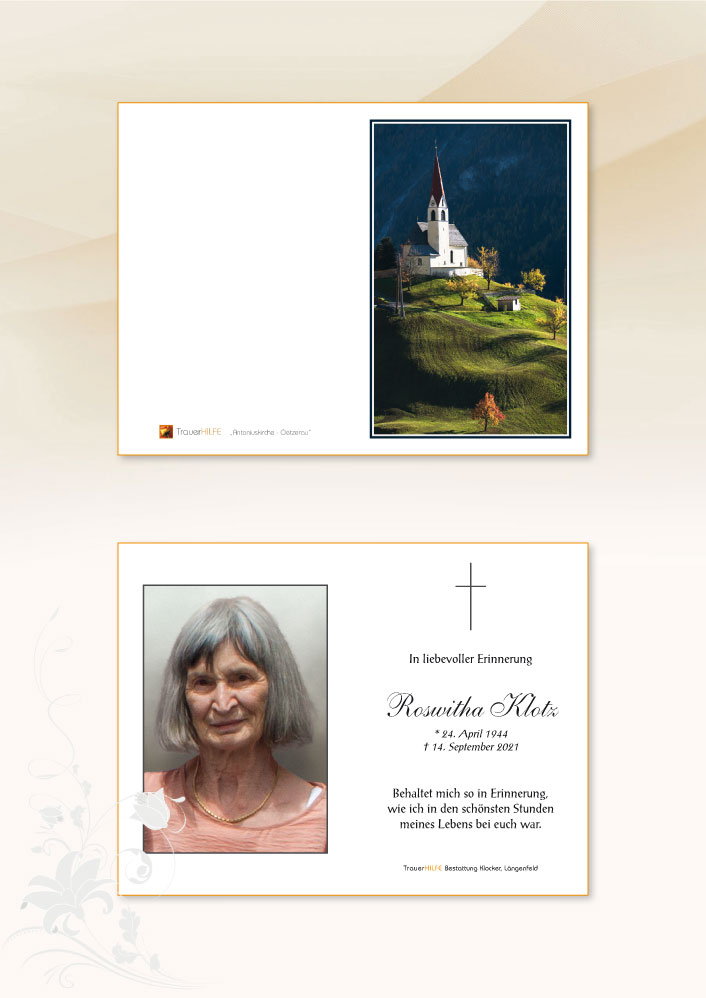 Bestattung wurde durchgeführt von: Daniel Klocker Bestattung Klocker GmbH Oberlängenfeld 41 6444 - Längenfeld Tel.: 05253 5561 zum Bestatter