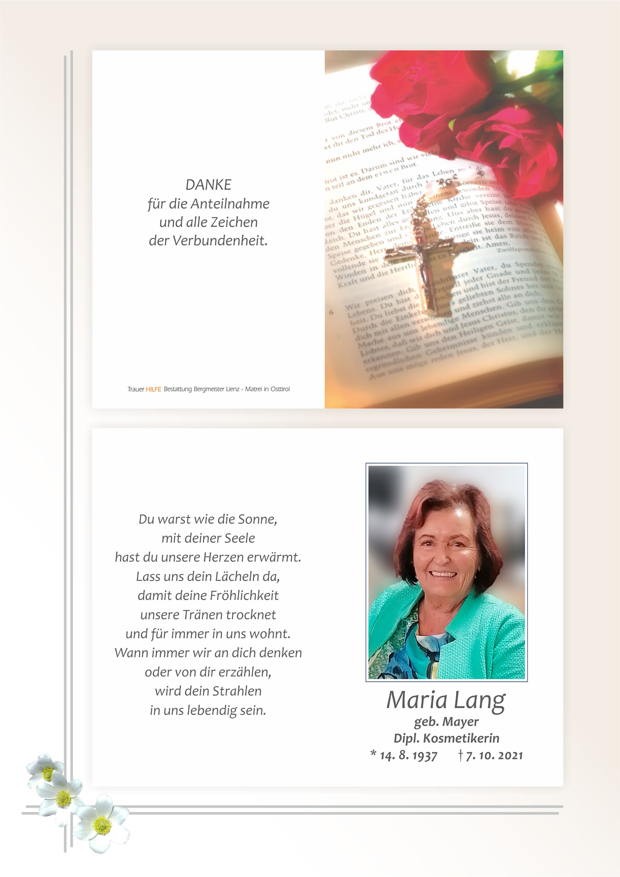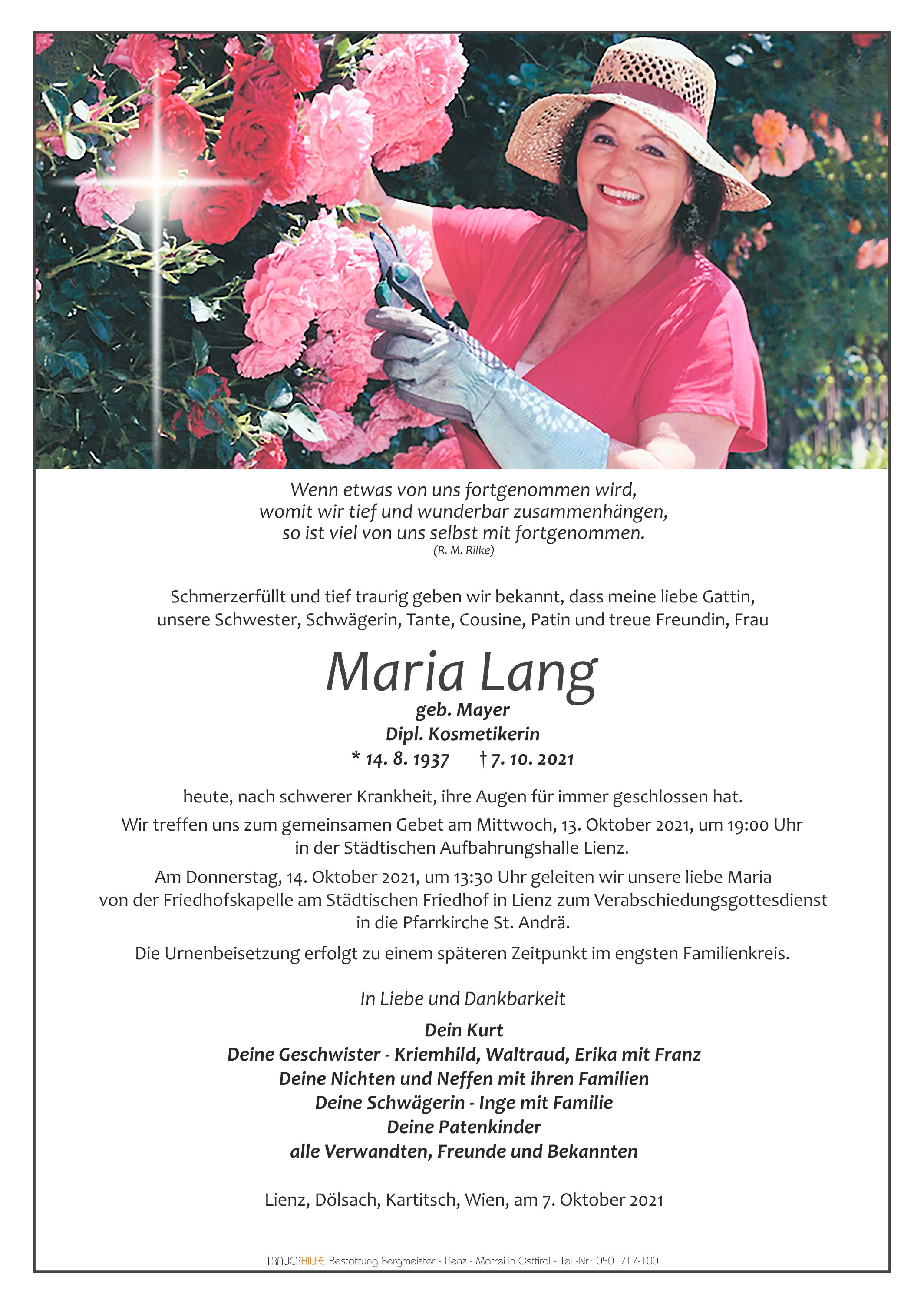 Tief berührt hat mich die traurige Nachricht, dass deine liebe Maria ihren Heimweg angetreten hat.