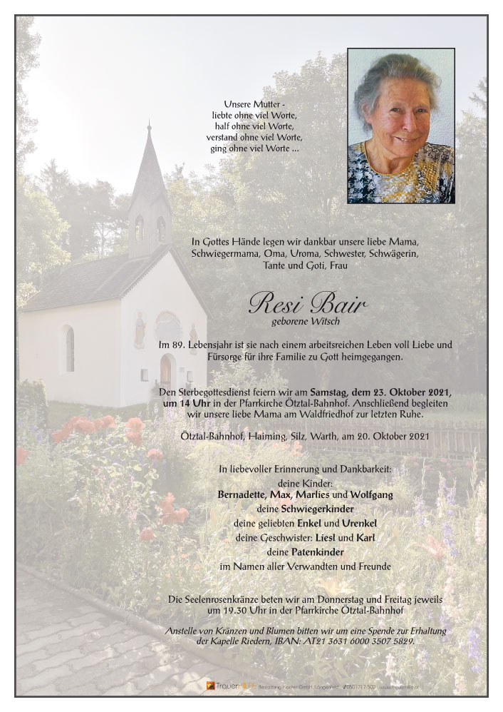 Geschätzte Trauerfamilie, wir möchten euch unsere aufrichtige Anteilnahme ausdrücken. Resi wird uns als einfache, hilfsbereite und kluge Gesprächspartnerin immer in guter Erinnerung bleiben. Sie wird auch uns fehlen, wenn wir an der Antoniuskapelle in Riedern vorbei spazieren.