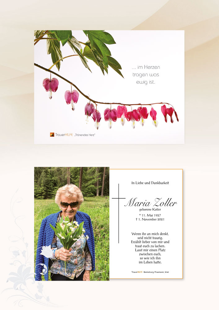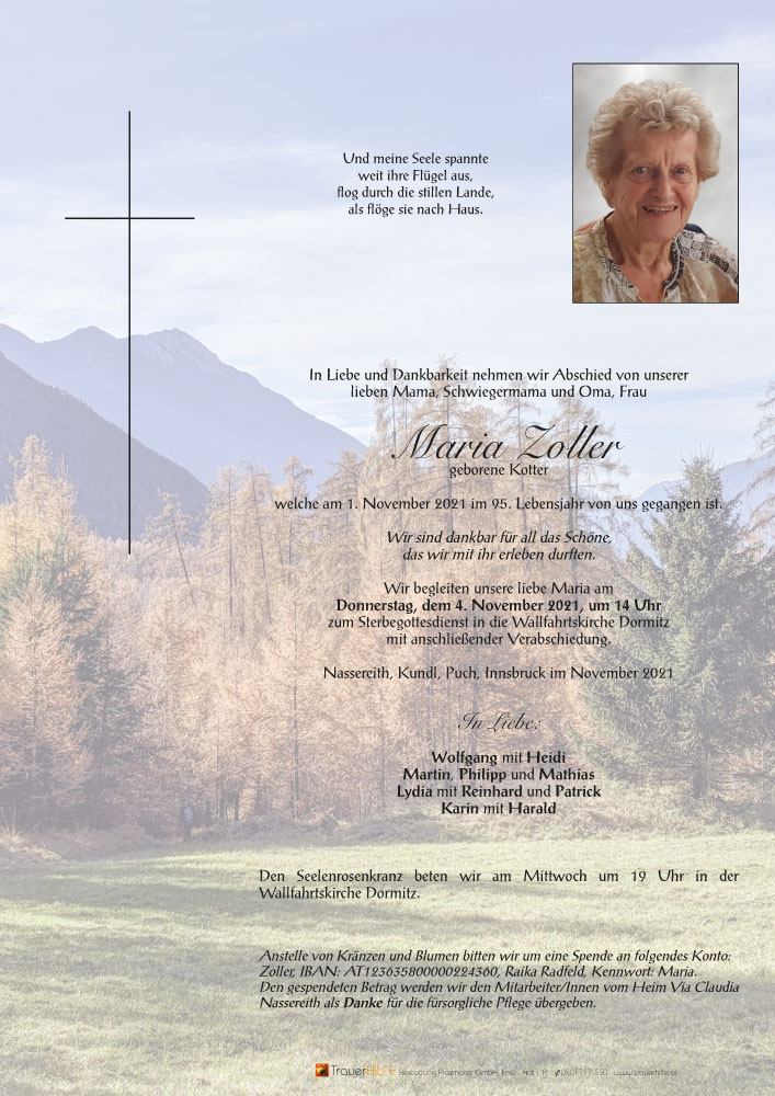 Begleitet von eurer Liebe und Fürsorge ist Maria nun von uns gegangen - eure Mama , welche ihr so geliebt und entsprechend umsorgt und verehrt habt, deren Liebe , Freude und Sein - Ihr , ihre Familie ward - alles Andere existierte nebenbei u. im Hintergrund, das machte Maria aus - dieses Wissen wird sicher ein Teil der Erinnerungen sein, welche ihr an sie nun weiter in Euch tragen werdet, er wird euch trösten und mit Wärme erfüllen - Uns ihrem Pflegeteam auch manchem ihrer Mitbewohner, habt ihr im Alltag immer wieder ins Bewusstsein geführt, wie stark das Band, die Liebe einer Familie sein kann - wenn sich die Räumlichkeiten auch notgedrungen änderten , das familiäre Miteinander habt ihr weitergelebt - auch wir werden Maria in unseren Erinnerungen behalten und sicher noch oft von ihr sprechen .