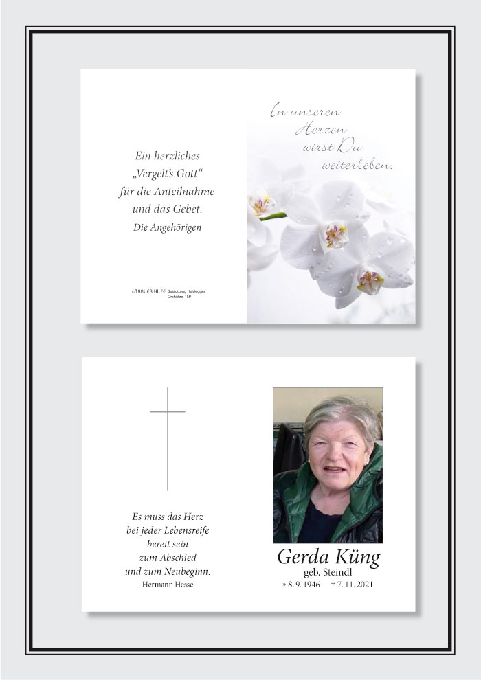 • Liebe Gerda! Nach langem und schweren Leiden hast du nun dein weltliches Leben beenden dürfen. Wir hoffen, dass es dir gut geht, da wo du jetzt bist!