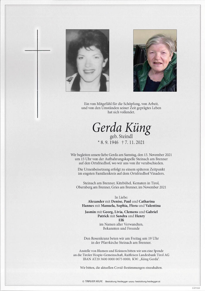 Bestattung wurde durchgeführt von: Karl Neurauter Karl Neurauter Bestattung Heidegger Brennerstraße 69 6150 - Steinach am Brenner Tel.: 05275 5211 zum Bestatter