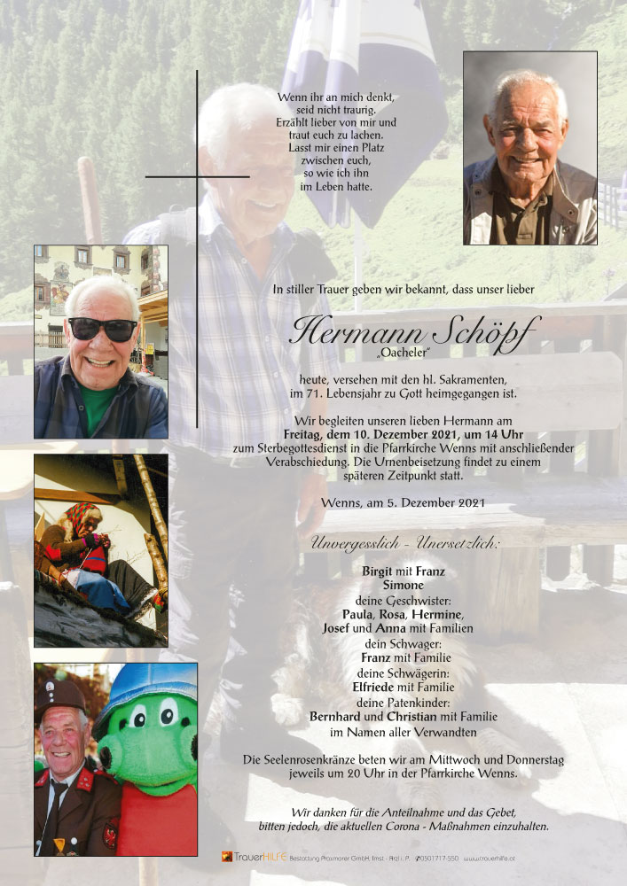 In stiller Trauer nehmen wir Abschied von unserem langjährigen Mitglied Hauptfeuerwehrmann (HFM) Hermann Schöpf „Oacheler“ der am 05. Dezember im 71. Lebensjahr, versehen mit den hl. Sakrament, zu Gott heimgegangen ist.