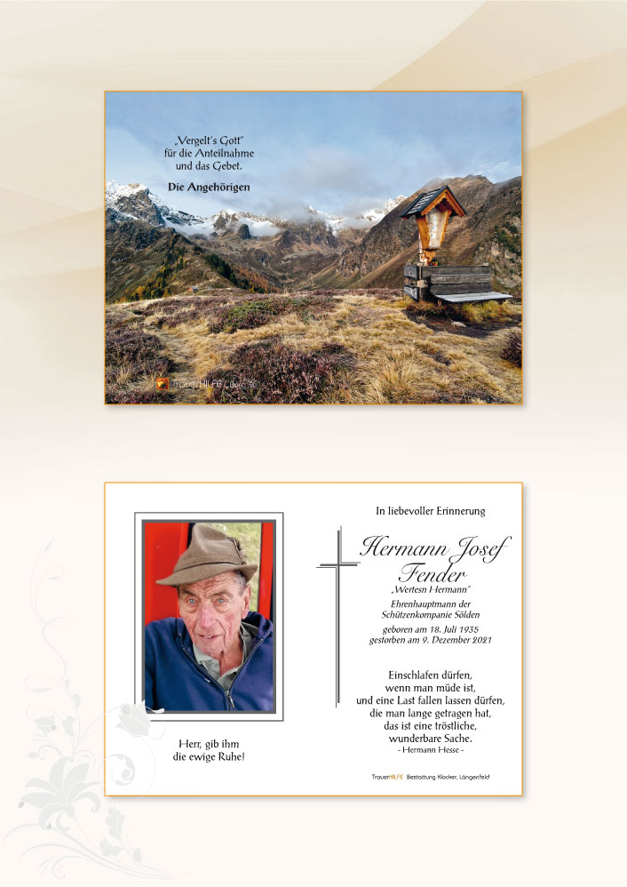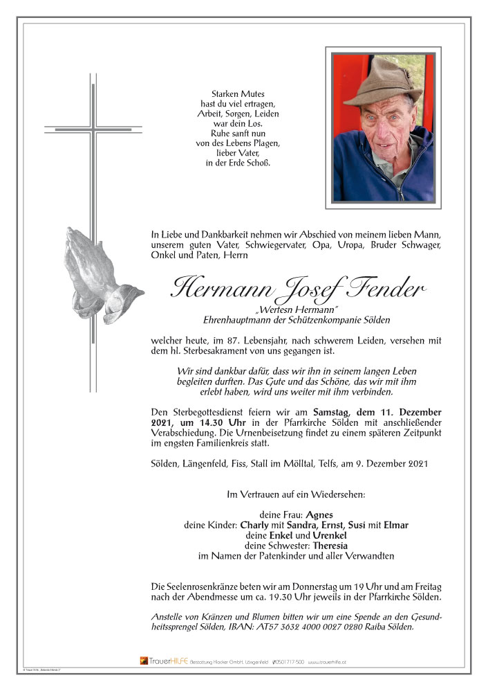 Hermann,als bester & treuer Freund meines Vaters Fredl der dir heuer schon vorausgegangen ist und den Du jetzt sicher dort wo du jetzt hingehst treffen wirst und weiter hoangarten konnst,möcht ich Dir Danke sagen für deine vielen Besuche bei uns und wünsch Dir a Guate Reise.